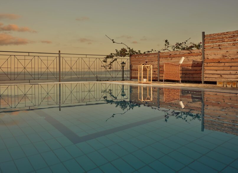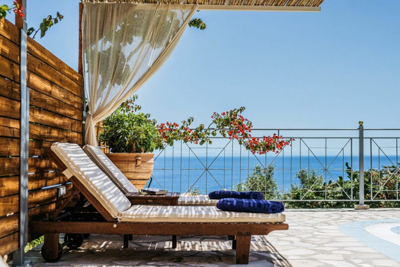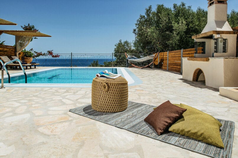 Eine Holztreppe führt zu den zwei Schlafzimmern und dem Badezimmer, das eine Jacuzzi – Badewanne, ein Föhn und Toilettenartikel beinhaltet. Der Aussenraum der Villa ist so angelegt, dass er die Privatsphäre und Erholung während der Ferien garantiert. Es gibt ein umzäuntes Areal 185 qm indem es einen Privatpool, Liegestühle und Sonnenschirme, sowie eine Loungebereich, ein BBQ- Platz und einen Essplatz gibt. Einen phantastischen Meerblick auf das Ionische Meer.