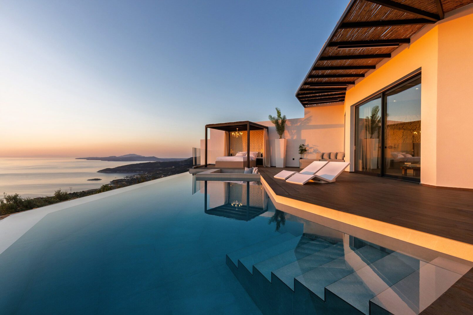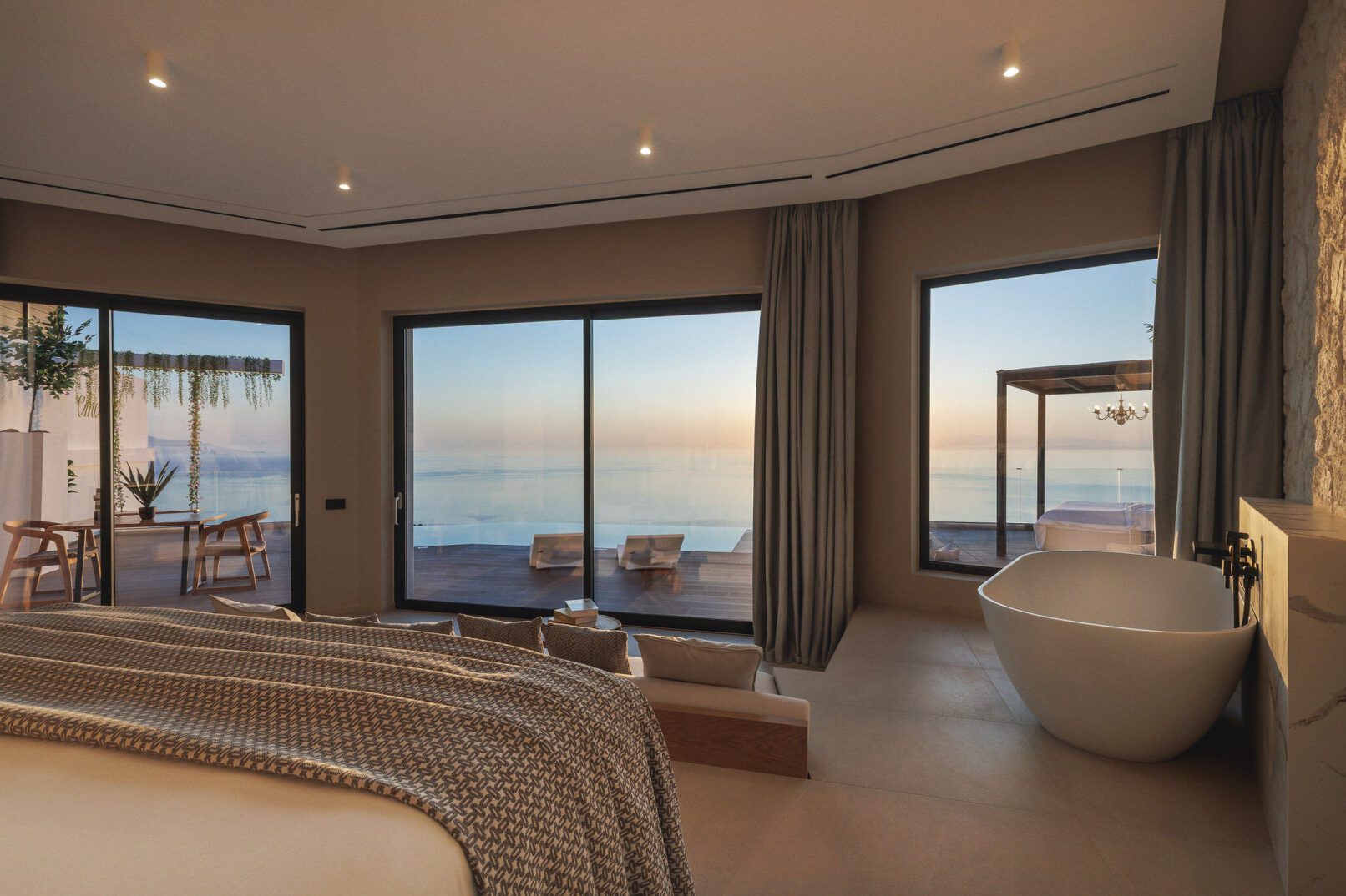 Die privaten Swimmingpools, Loungebereiche und andere luxuriöse Annehmlichkeiten sorgen garantiert für Unterhaltung für alle.Die Kulisse ist perfekt für Hochzeitsreisende, die Romantik und Entspannung vor der Kulisse des atemberaubenden Panoramablicks über die weite Weite des Ionischen Meeres suchen.