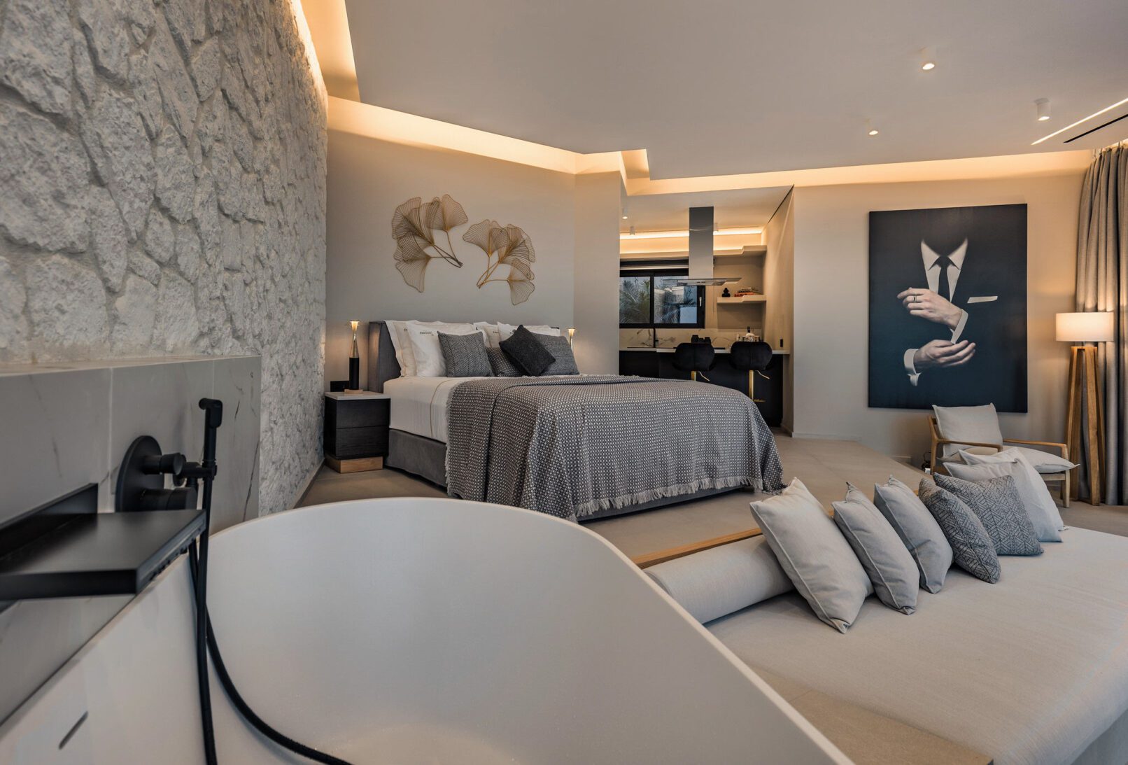 Es gibt auch ein luxuriöses Hauptschlafzimmer mit minimal dekoriertem BadezimmerDas Äußere der Suite ist ein ultimatives Paradies. Der großzügige Bereich ist so gestaltet, dass er Ihnen maximale Privatsphäre bietet.