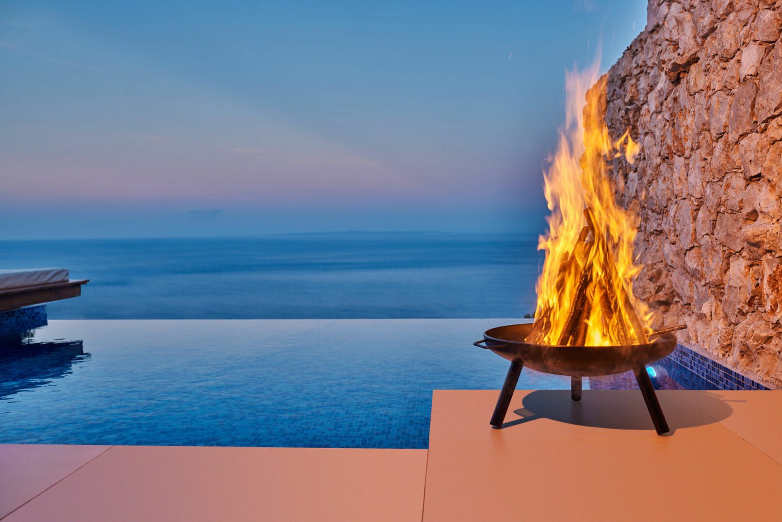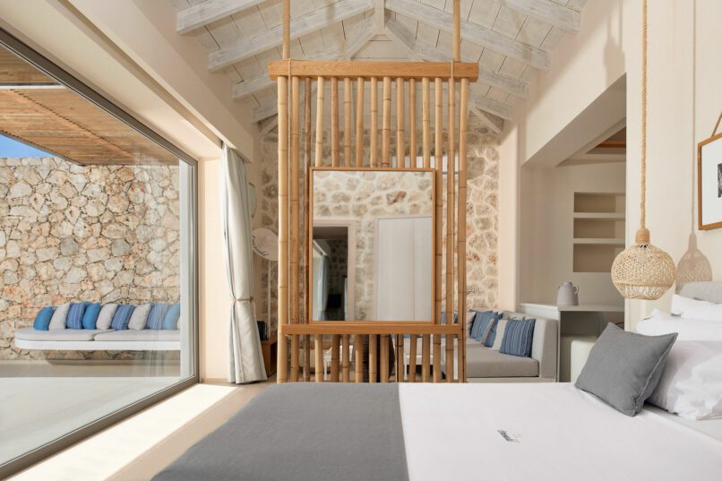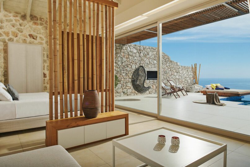 Bodenhohe Glasschiebetüren lassen die griechische Sonne in den Raum gleiten und führen Sie auf eine private Terasse mit Meerwasser –Infinity Pool. Liegestühlen, einer Lounge area und bietet einen Panoramablick auf das Ionische Meer.